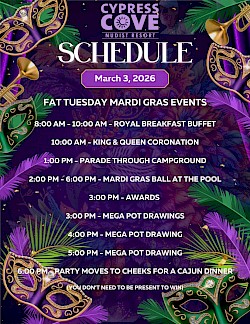 The Mardi Gras Committee has an exciting update to share: this year’s Mardi Gras Celebration at Cypress Cove will take place on Tuesday, March 2 - 3, 2026.