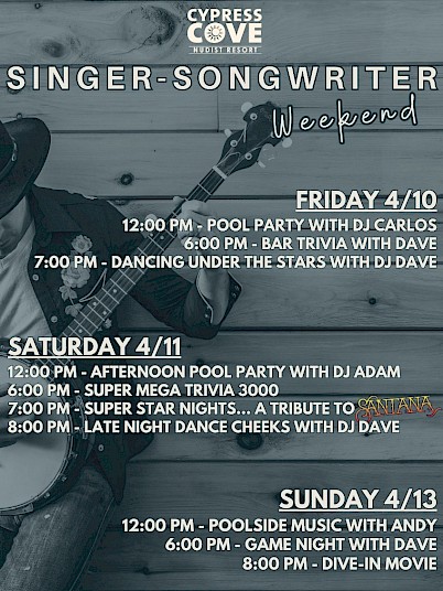 Singer Songwriter Weekend strikes the perfect chord at the Cove, blending laid-back vibes with high-energy entertainment all weekend long. Kick things off Friday with a sun-soaked pool party set by DJ Carlos, then roll into the evening with Bar Trivia, followed by dancing under the stars with DJ Dave—because great weekends should start strong and end on the dance floor.