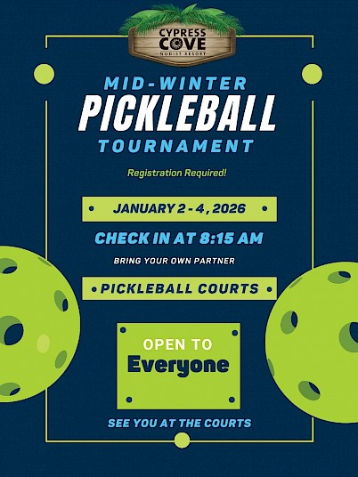 Kick off the new year with competition, camaraderie, and plenty of pickleball fun at our 2nd Annual Mid-Winter Pickleball Tournament, January 2–4, 2026. This three-day event features divisions for 70+ Men’s & Women’s, All-Ages Men’s & Women’s A & B, Open, and Mixed play, giving players of all ages and skill levels a chance to get in the game.