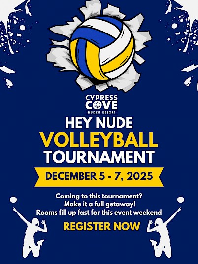 It’s almost time for one of the most exciting weekends of the year at Cypress Cove Nudist Resort — the Hey Nude Volleyball Tournament! Whether you’re here to play hard or just soak up the sunshine and good vibes, this weekend is always one to remember.