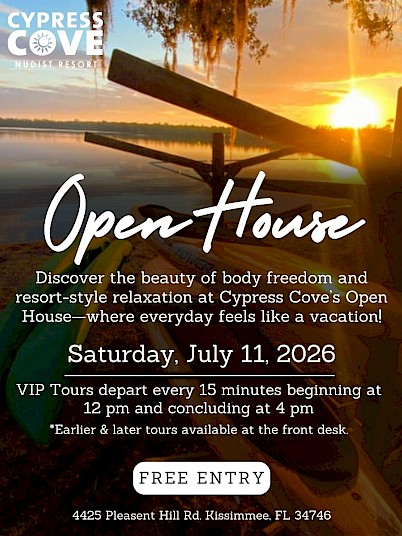 Come celebrate with us at the Annual Open House at Cypress Cove Nudist Resort, where we’ve just celebrated 60 years of providing a welcoming, family-friendly naturist haven! Join us for a day of exploration and relaxation as you discover why we’re Florida’s #1 naturist resort, offering a unique experience for all ages.