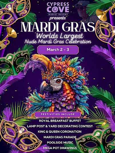 The Mardi Gras Committee has an exciting update to share: this year’s Mardi Gras Celebration at Cypress Cove will take place on Tuesday, March 2 - 3, 2026.