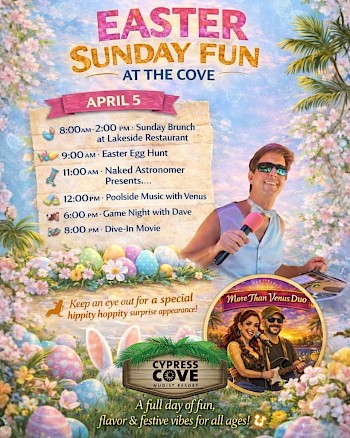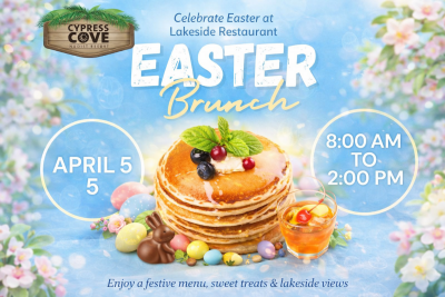 Celebrate Easter Sunday with a beautiful lakeside brunch at Cypress Cove! Join us at Lakeside Restaurant on April 5th from 8:00 AM to 2:00 PM for a festive morning filled with delicious brunch favorites, sweet treats, and relaxed holiday vibes.