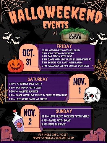 Halloween Events at Cypress CoveGet ready for a frightfully fun weekend where the Cove comes alive after dark! Friday night kicks off with Speed Limit 70 rocking the Halloween Party at Lakeside... plus trick-or-treating for the kids, Halloween Trivia, a Costume Contest, and a glow-lit pool party that’ll keep the vibes hauntingly good all night long.