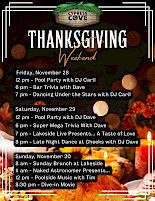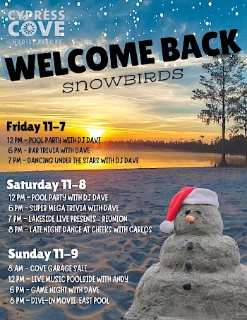 Welcome Back SnowbirdsThe wait is over — our favorite flock is back at the Cove! Join us November 7–9 for a weekend full of music, laughter, and lakeside fun as we celebrate the return of our winter residents in true Cypress Cove style. Soak up the sunshine with pool parties and DJ Dave, test your smarts with trivia nights, dance the night away at Cheeks with Carlos, and enjoy live music poolside plus a dive-in movie under the stars. Don’t forget to check out the Cove Garage Sale on Sunday morning for treasures galore! It’s the perfect way to kick off the season — reconnect with old friends, make some new ones, and let the good times roll!