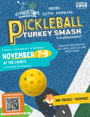 Mark your calendars, rally your teammates, and get ready for a weekend packed with friendly competition, great camaraderie, and plenty of pickleball fun at Cypress Cove. For event times and details, email info@covepickleballclub.com or sign up for the Cove Pickleball Club newsletter.
