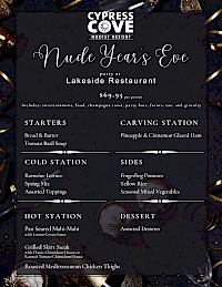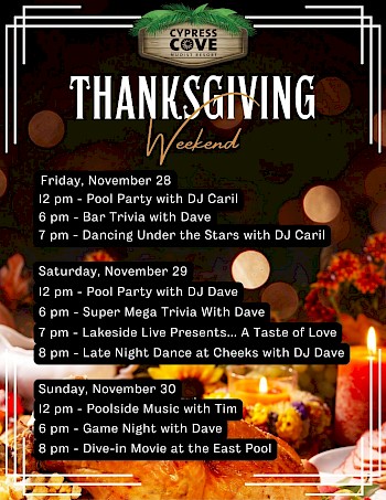 Join us at Cypress Cove Nudist Resort's Lakeside restaurant this Thanksgiving Day for a memorable holiday feast! From 3 pm to 7 pm, we'll be serving up a delectable spread of all your traditional favorites.