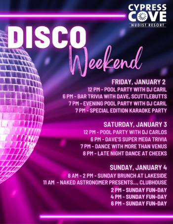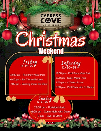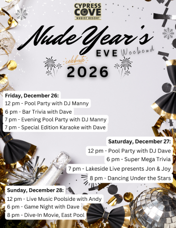 Ring in the New Year the most unforgettable way—Nude Year’s Weekend at Cypress Cove Nudist Resort! Join us for a full weekend of energy, entertainment, and festive celebration as we welcome 2026 together.