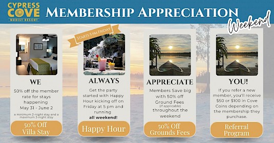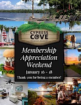 Experience the ultimate Membership Appreciation Weekend at Cypress Cove January 16 - 18! We're dedicated to celebrating our valued members, and this weekend brings exclusive perks just for you.