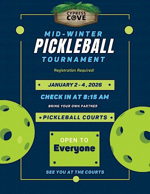 Kick off the new year with competition, camaraderie, and plenty of pickleball fun at our 2nd Annual Mid-Winter Pickleball Tournament, January 2–4, 2026. This three-day event features divisions for 70+ Men’s & Women’s, All-Ages Men’s & Women’s A & B, Open, and Mixed play, giving players of all ages and skill levels a chance to get in the game.