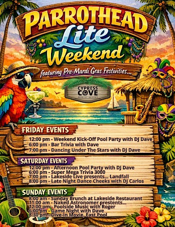 Mardi Gras CelebrationThe Mardi Gras Committee has an exciting update to share: this year’s Mardi Gras Celebration at Cypress Cove will take place on Tuesday, March 2 - 3, 2026. Why the change? We want to make sure no one misses out! By shifting the celebration just a bit, our Cove family can enjoy Mardi Gras in the best of both worlds: