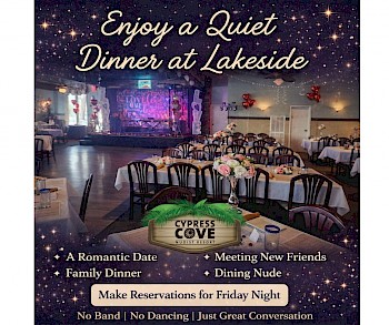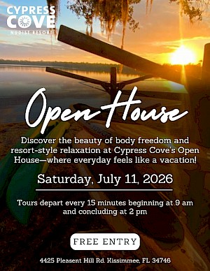 As part of Nude Recreation Week —yes, there is a national week for that—Cypress Cove is opening its doors to first-time visitors for an Open House event on Saturday, July 11, with guided VIP tours from Noon until 2:00 p.m. What happens at a nudist resort open house? Simply put, Cypress Cove invites first-time visitors so they can see how much fun au natural recreation can be. With complimentary resort tours, food for purchase, music by the pool, and access to all resort amenities, you can bring your curious family and friends to FINALLY introduce them to Cypress Cove. It's free admission ALL day, so come out and see what REAL freedom feels like.