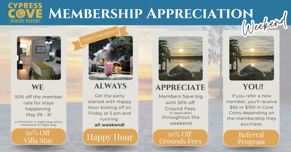 Membership Appreciation Weekend is May 29 - May 31 at Cypress Cove Nudist Resort! As a token of our gratitude for your ongoing support, we've lined up some exclusive specials just for our cherished members.