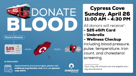 Roll up your sleeve and help save lives! The OneBlood Big Red Bus will be at Cypress Cove on Sunday, April 26, from 11:00 AM to 4:00 PM.