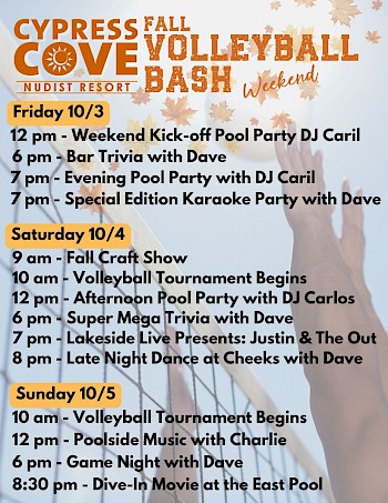 Get ready for one of Cypress Cove’s most exciting weekends of the season—our Fall Volleyball Bash! The courts will be alive with friendly competition all weekend long, while the rest of the resort buzzes with live entertainment, themed parties, poolside music, the fall craft show, trivia challenges, and even a dive-in movie under the stars. Whether you’re here to play in the tournament, cheer from the sidelines, or simply soak up the festive fall vibes, this is a weekend you won’t want to miss!
