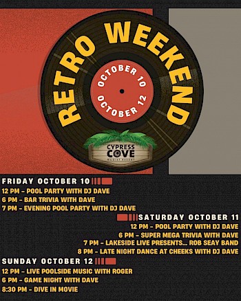 Get ready for a frightfully fun weekend where the Cove comes alive after dark! Friday night kicks off with Speed Limit 70 rocking the Halloween Party at Lakeside... plus trick-or-treating for the kids, Halloween Trivia, a Costume Contest, and a glow-lit pool party that’ll keep the vibes hauntingly good all night long.